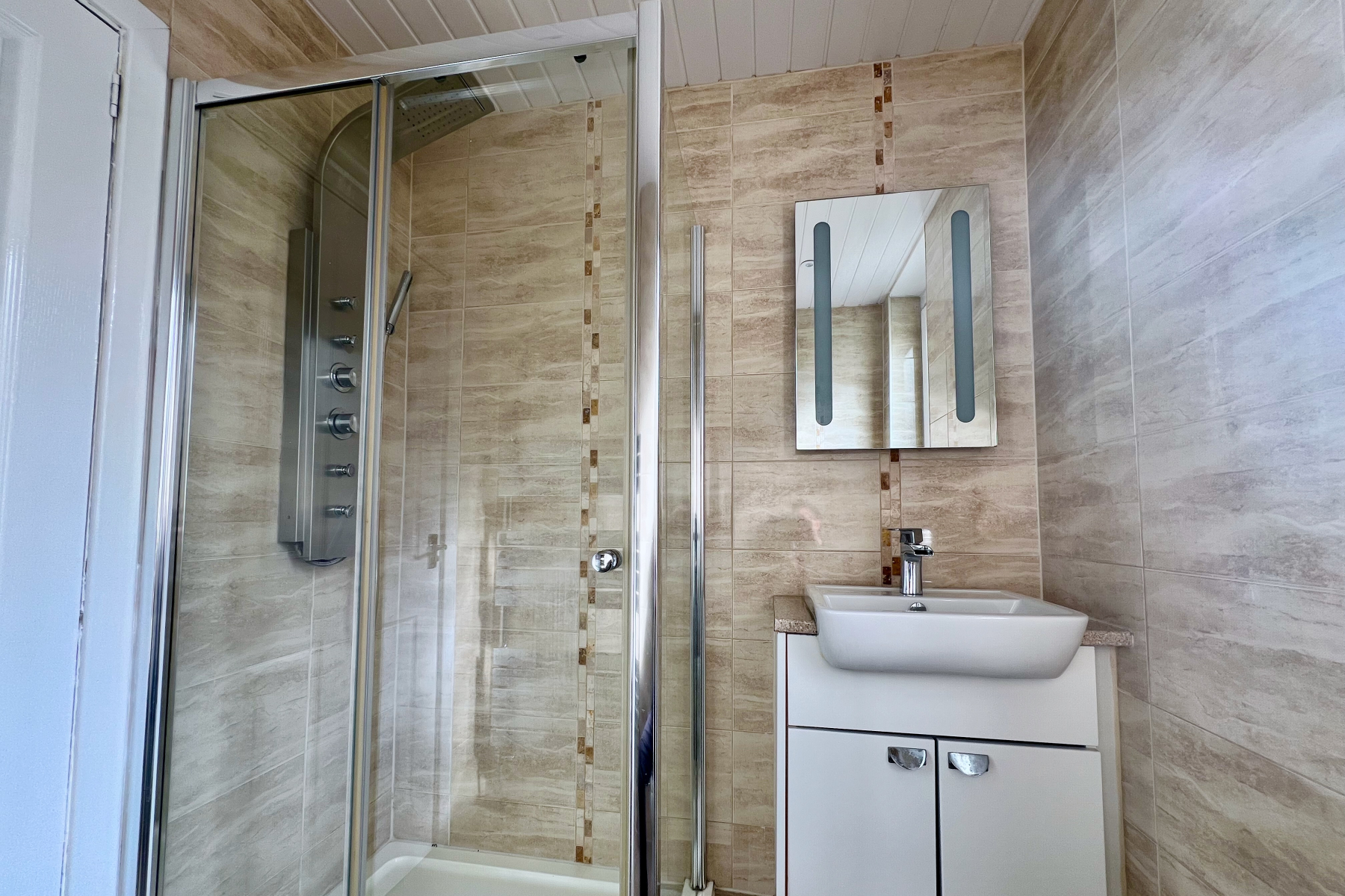 The interior has been tastefully finished, inlcuding neutral decor, a modern kitchen, and a contemporary bright, fresh shower room. Central heating ensures warmth throughout, while the abundance of natural light enhances the overall sense of space.