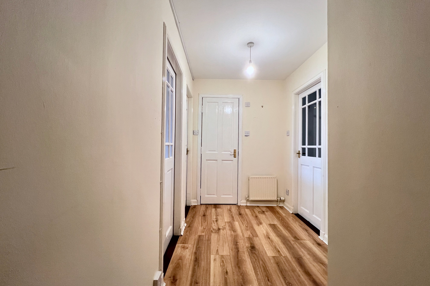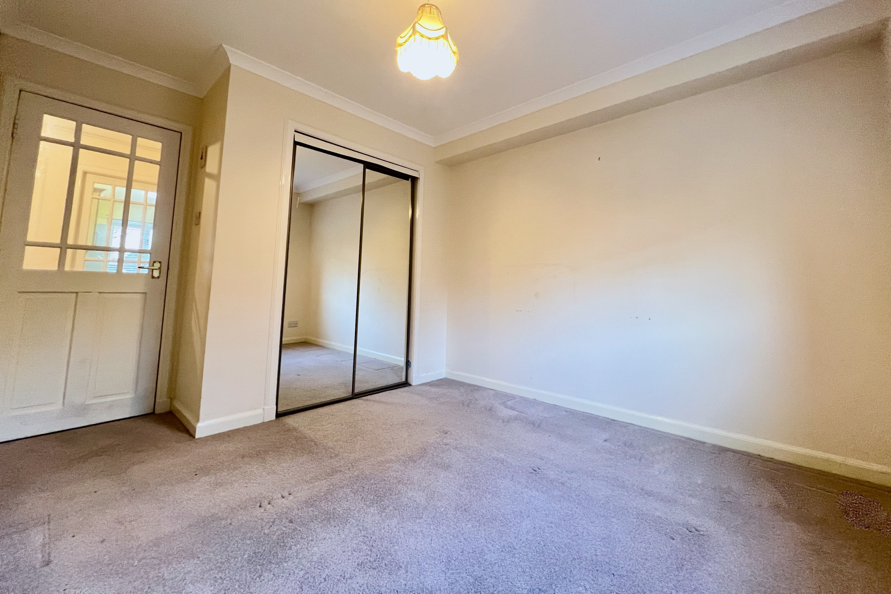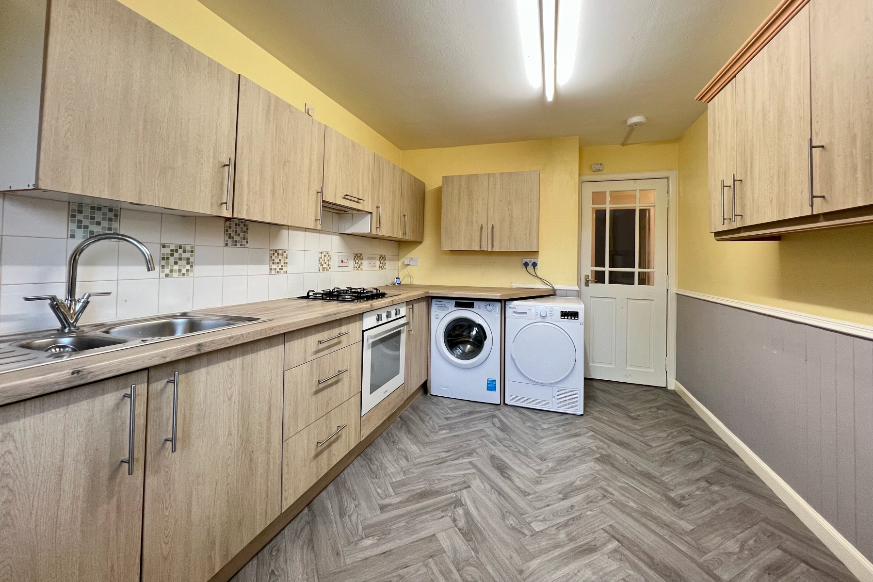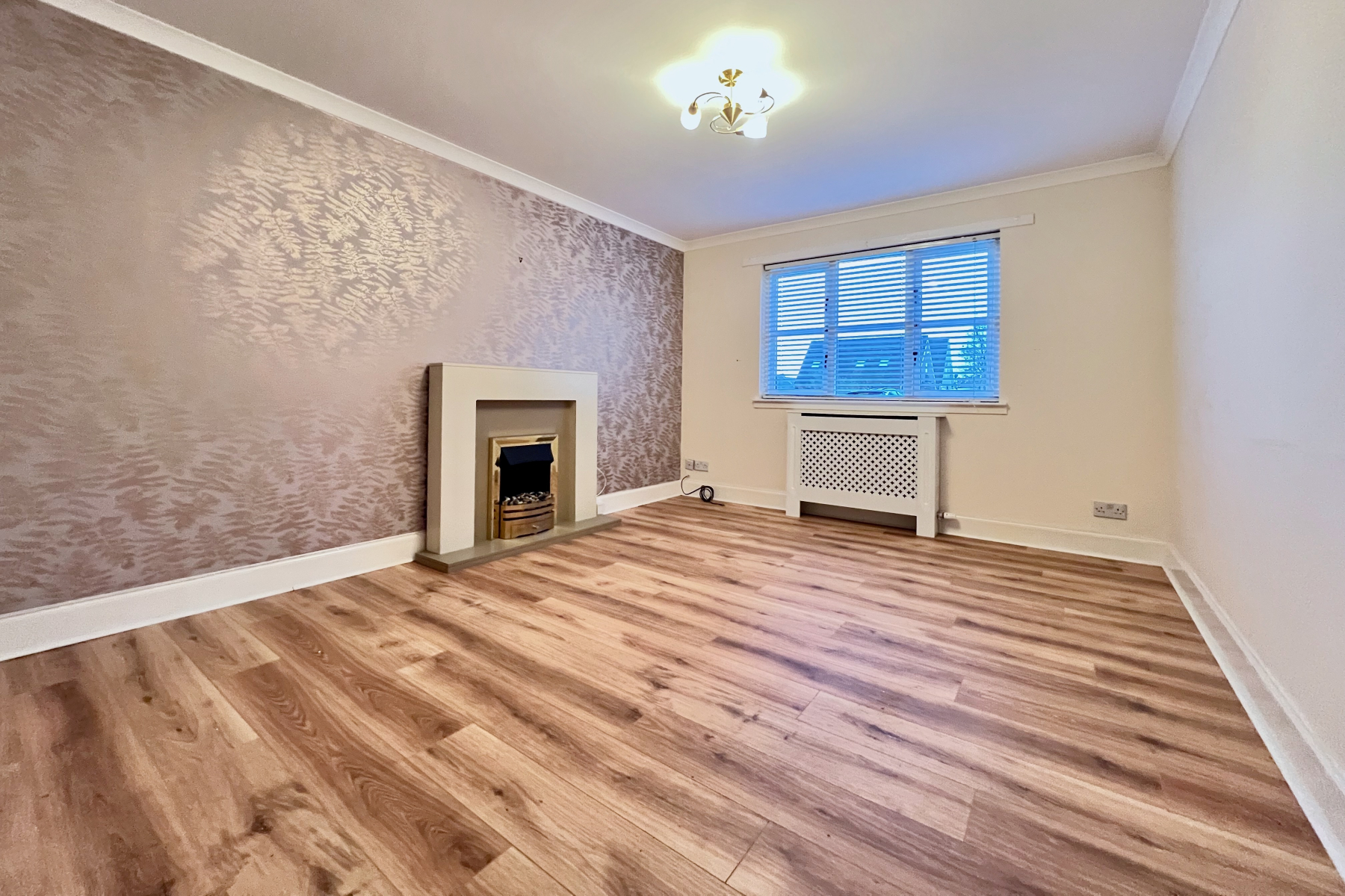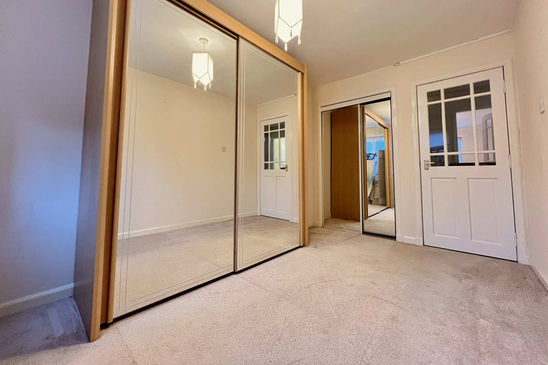 Presented unfurnished, the property features two double bedrooms—both with built in mirrored wardrobes. A generous lounge connects via the hallway to a well-equipped fitted kitchen, complete with an electric oven and gas hob, as well as, free standing washing machine, condenser tumble dryer, and fridge/freezer. The modern wetroom is fitted with a electric shower, whiite wash hand basin and WC, offering a fresh contemporary finish.